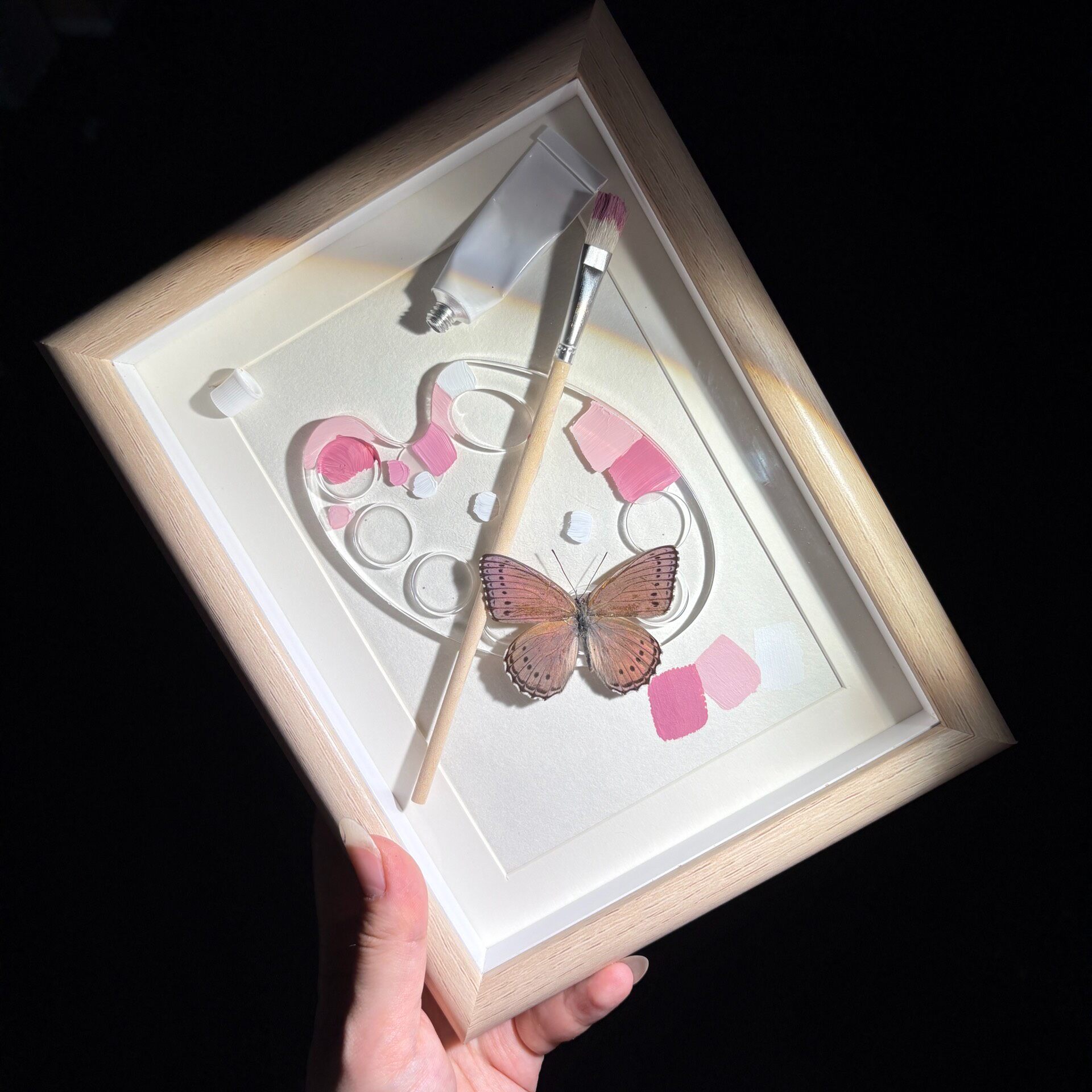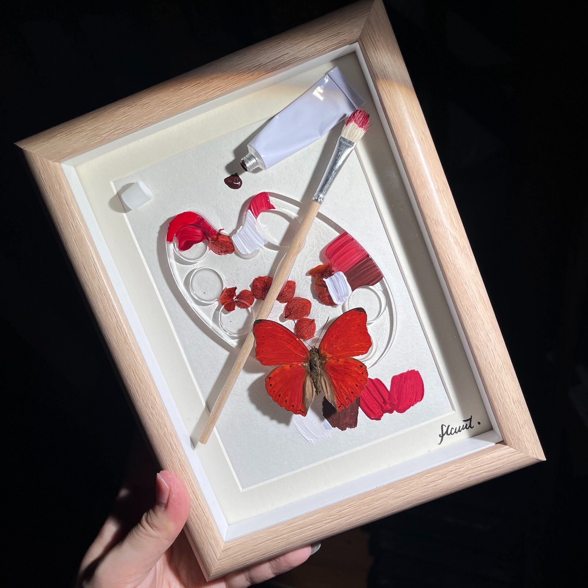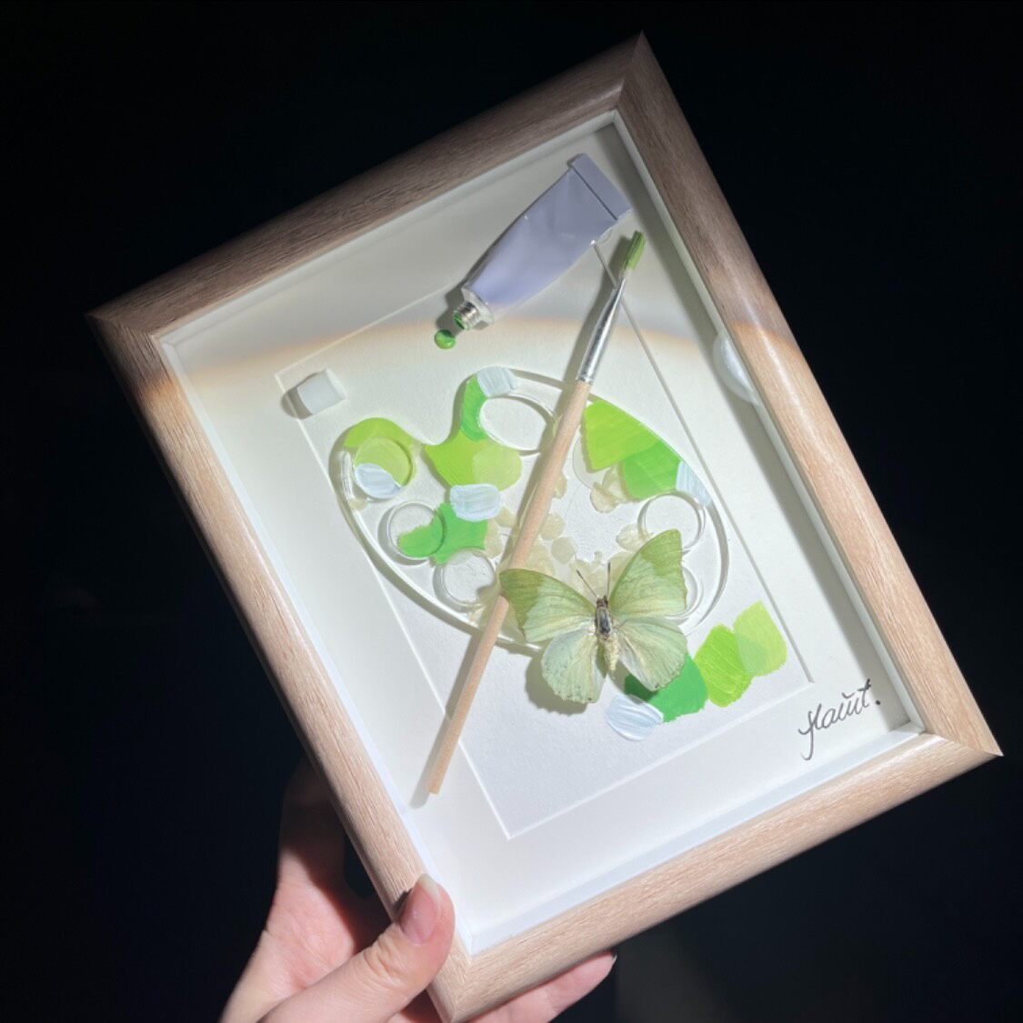 Type: Blue papilio with a hand-painted palette background, wool brushes and a palette with paint residues, a pair of artistic creatures, the palette is made of epoxy and dried flowers.
