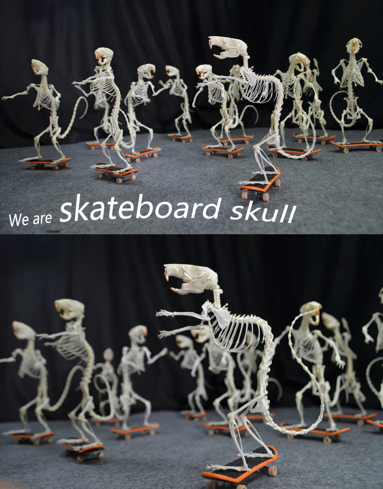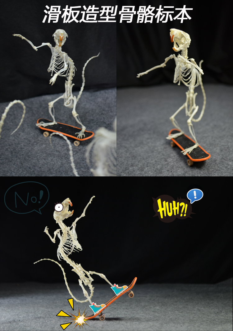 The skeleton of a mouse that is skateboarding is made of a big white mouse, and the size will vary slightly.The height of the skeleton is about 10~13 cm, and the length of the skateboard is 9.5cm.