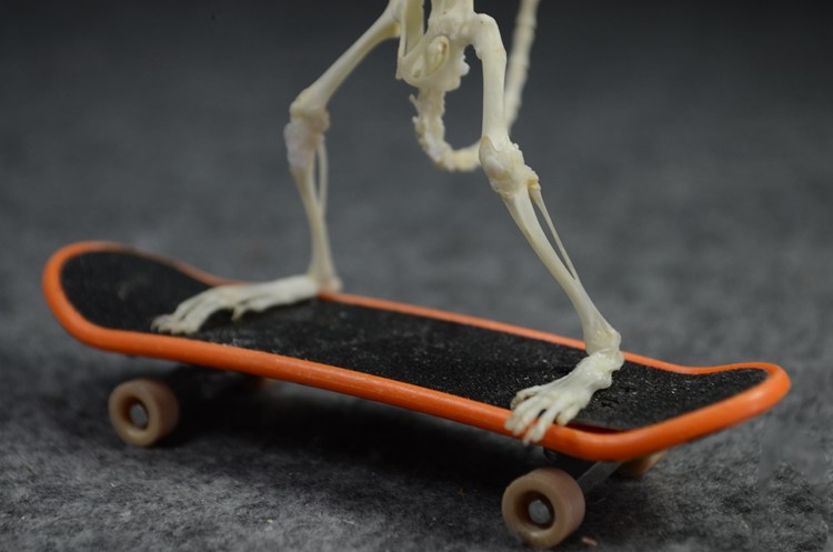 Skateboarding mice, real bones, mouse bone specimens.